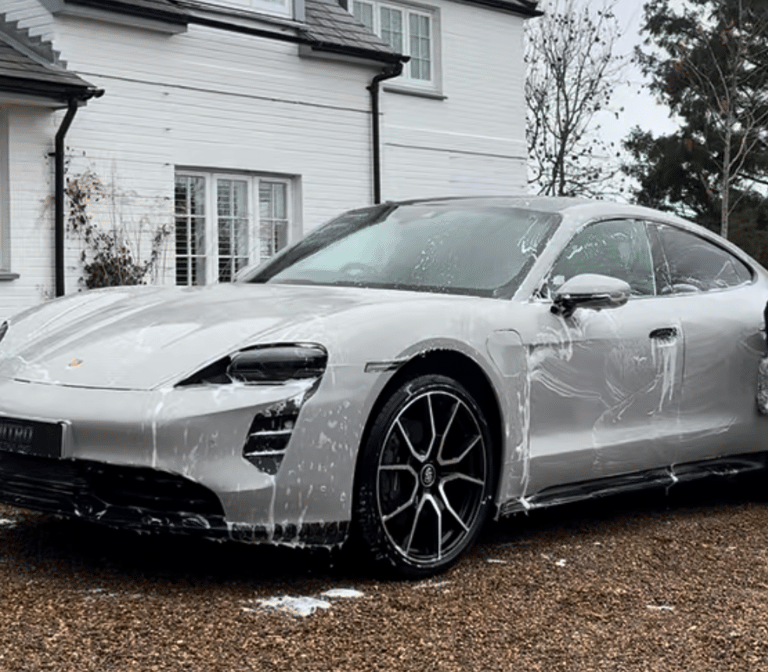 Prewash applied in full coverage to the car, wheels and arches to release dirt with a layer of snow foam over the top for drag then allowed to dwell and breakdown the dirt before being rinsed